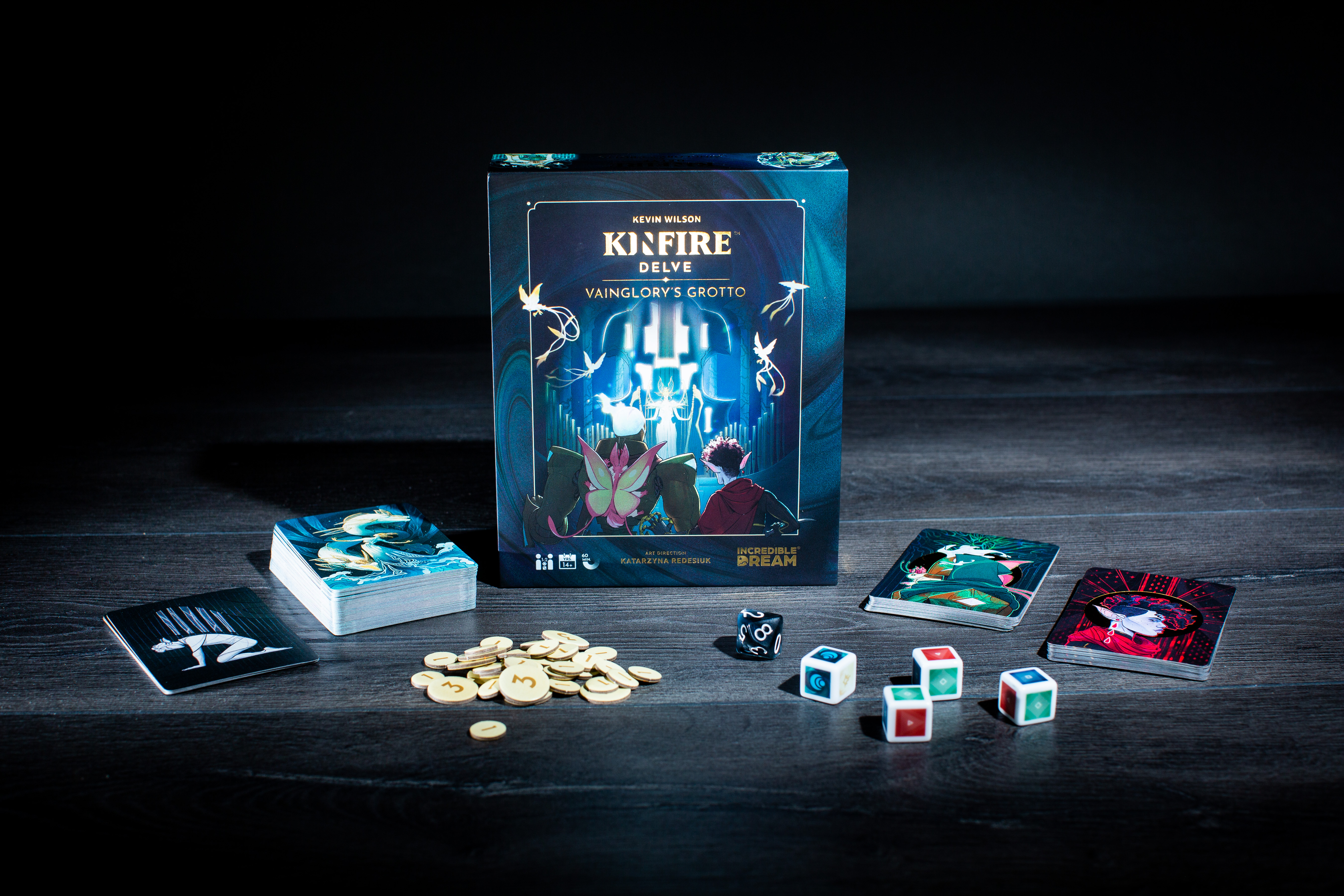 Kinfire Delve is a cooperative card & dice game series for 1-2 players that offers a unique dungeon delving experience that combines tactics with press-your-luck.